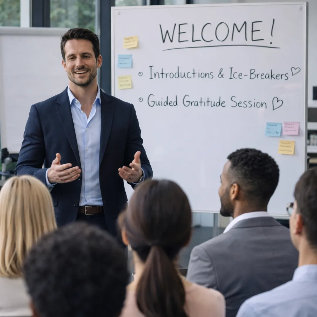 A warm welcome + guided gratitude session to open the room (2 min per person)